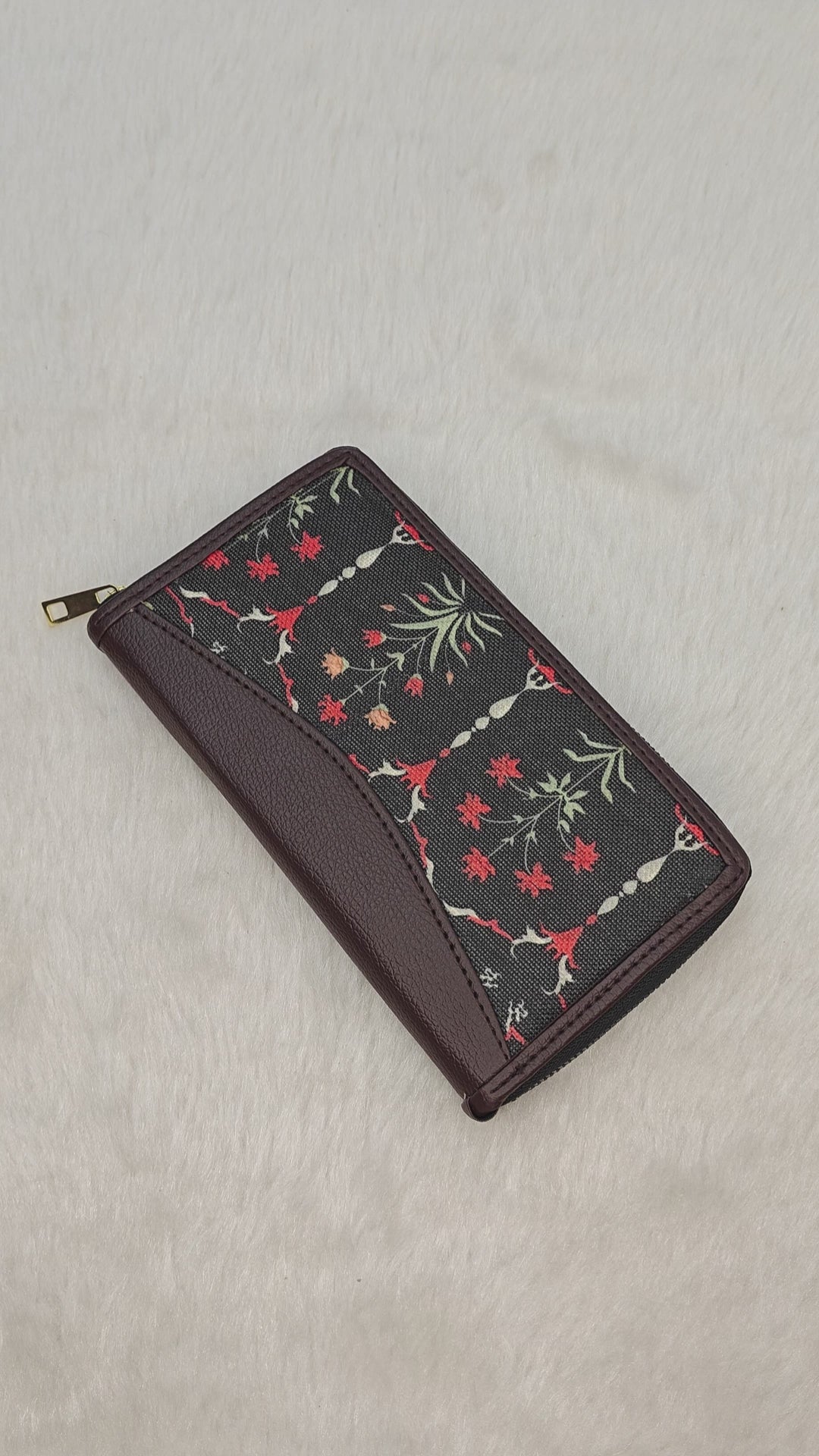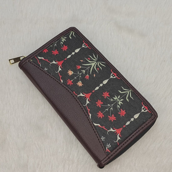 Introducing the Women Zipper Wallet, an accessory perfect for the modern and fashion-forward woman. This exquisite wallet features a soft, vegan leather exterior that is finished off with a chic chain zipper. The traditional and beautiful patterned Jute fabric on the outside exudes sophistication and style. The wallet's compact size of 8.5 inches by 5 inches is perfect for carrying it around wherever you go.